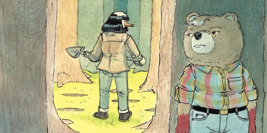 With the title taken from the classic Teddy Bear’s Picnic lyrics, Horvath’s graphic novel twists both this line and the trope of anthropomorphic animals, transforming them from something wholesome into something deathly morbid.