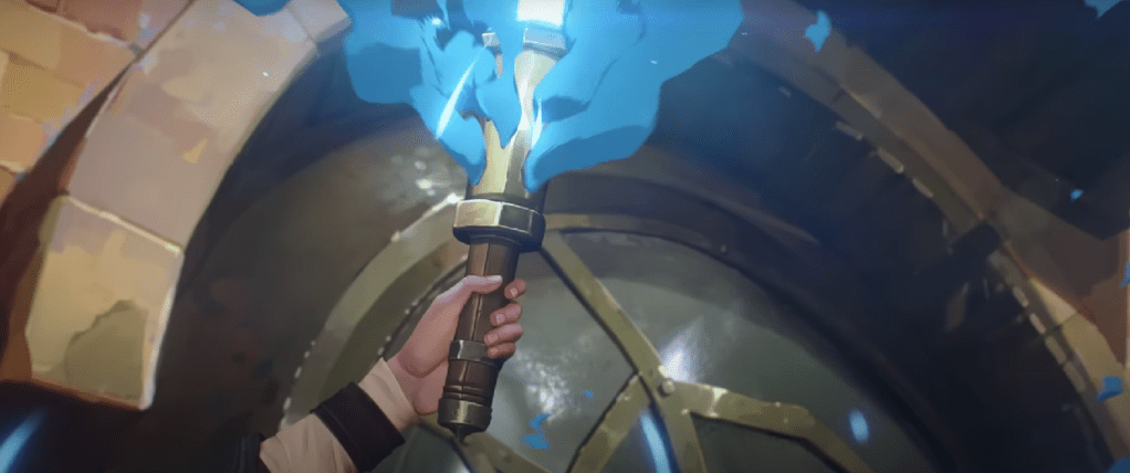 Next, we see Ambessa telling someone, probably Mel if she survived, that they must declare martial law. We see the effects of this as Ambessa’s Noxian forces arrive, Enforcers set up barricades, and an Enforcer even beats one of Ekko’s people with a baton. Since the Firelights are also a target, that means Ekko is probably going to have to reluctantly work with Jinx, since she has become a symbol for Zaun in the wake of the attack. Sevika herself says this, as we see shots of Vi looking at artwork of Jinx and Vander, and people touching Jinx as they pass her. These people also seem to have dyed their hair blue to resemble Jinx, showing their devotion to her. Further proof of Jinx’s revolutionary status is someone, who the trailer implies to be Jinx, holding up a blue flair to which the citizens of Zaun raise their fists. However, despite what the trailer implies, I do not think it is Jinx holding up this flair. The hand does not look slender enough to me, and there is no nail polish. Could it be someone co-opting Jinx’s cause?