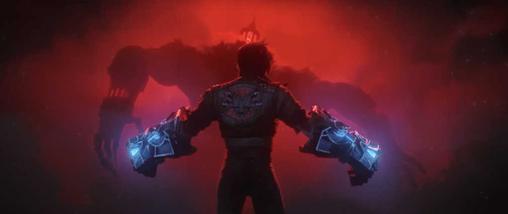 The trailer then ends with a series of quick shots which I had to go frame by frame to see what was happening. The first shot shows a mysterious figure holding a ball of energy similar to ones seen earlier in the trailer. The figure reminds me a lot of the man who saved Jayce when he was a kid so maybe that is connected? We then see someone carrying a much younger Jinx away. This probably takes place at the bridge where she and Vi lost their parents, before Vander adopted them. Following this, we get a shot of Ekko pulling a cord on some device, causing it to light up. Next, we see Caitlyn struggling against a Chemtank. The subsequent shot possibly shows us Viktor, as we see a figure with a cane and Hextech emerging from their wrist. Then we see a shadowy figure resembling Silco. This shot most likely confirms that Jinx is going to be hallucinating Silco this season. In one of the most epic shots of the trailer, we then very briefly see Vi facing off against Warwick. She is also wearing the jacket I think older Vi is wearing, so this confrontation will likely take place post time skip.