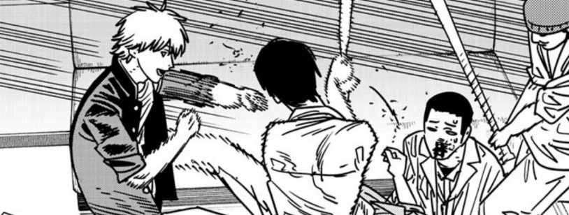 Denji eventually exits the room and beats up all of his attackers, actually looking pretty pleased with himself.
