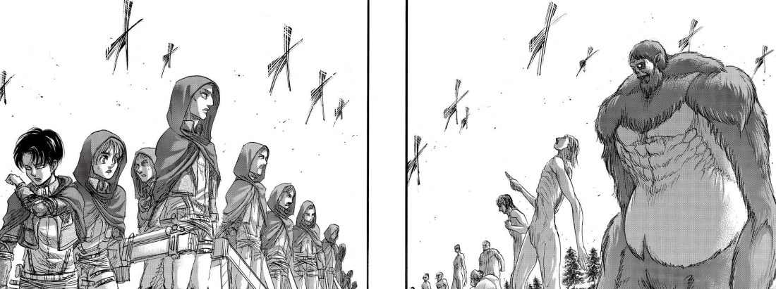 After this, we get a scene with Reiner and Bertholdt talking with the Beast Titan, before the Scouts arrive.