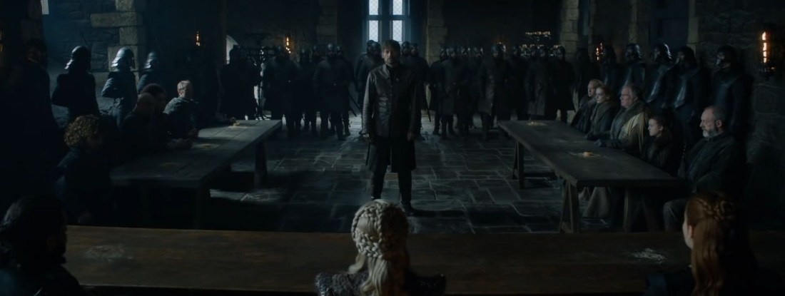 The scene also ends comedically when Simon is incredulous about taking the throne and Daemon responds, “It’s a big chair made of swords.”