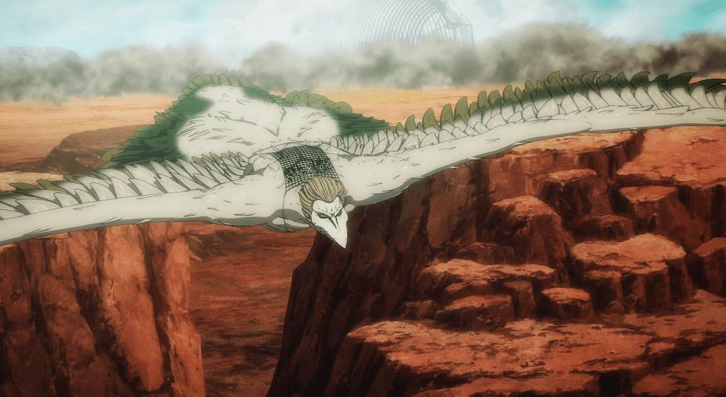 Now safe on Falco’s back, the Alliance discusses their next move, and all regretfully agree that their only option is to kill Eren, much to Mikasa’s horror.