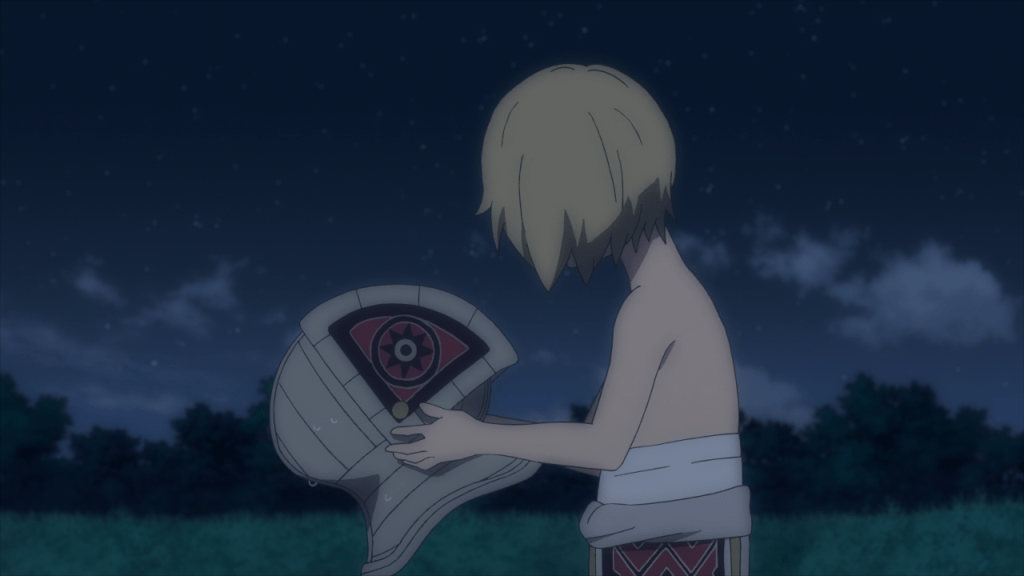 The dread deepens as Aki enters the cell with the Future Devil and sees its eye peering out at him from the darkness, ending the episode on another cliffhanger, before transitioning to the tenth ED, “Dogland” by People 1.
