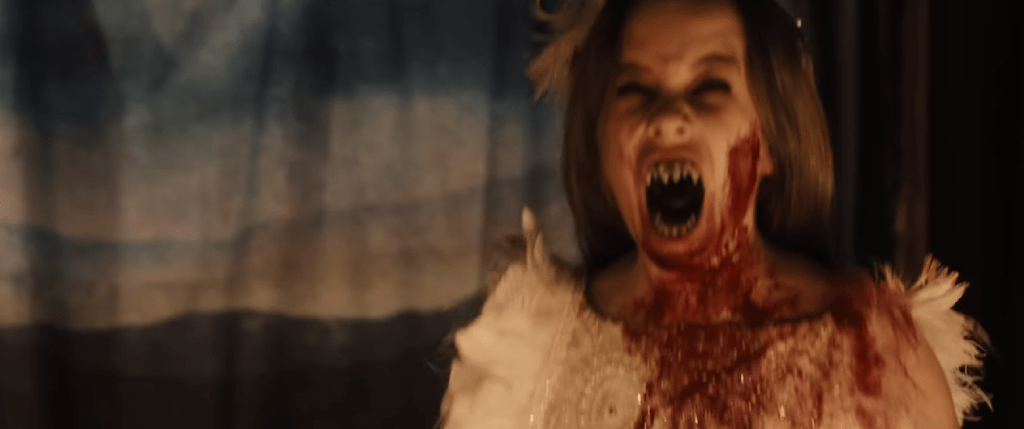 The first half-hour to forty-five minutes of the movie is spent building up the mystery of what’s going on until Abigail’s vampiric nature is revealed.