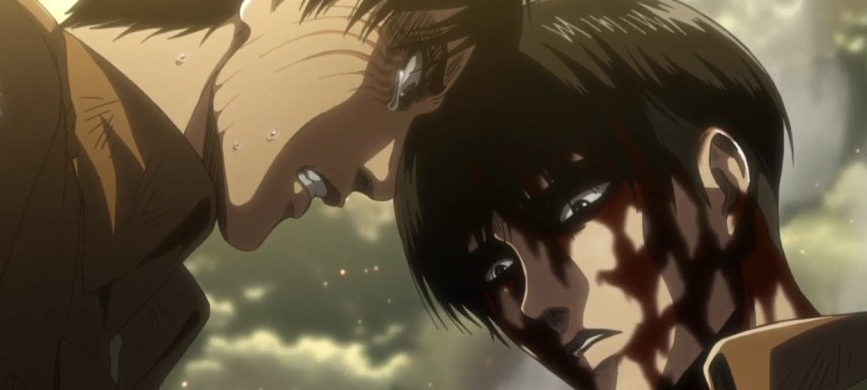 With Eren being dragged away by Floch, Levi goes to inject Erwin and experiences a series of flashbacks from hearing Armin’s speech about the ocean, to Kenny giving him the serum, to him telling Erwin to die for them.
