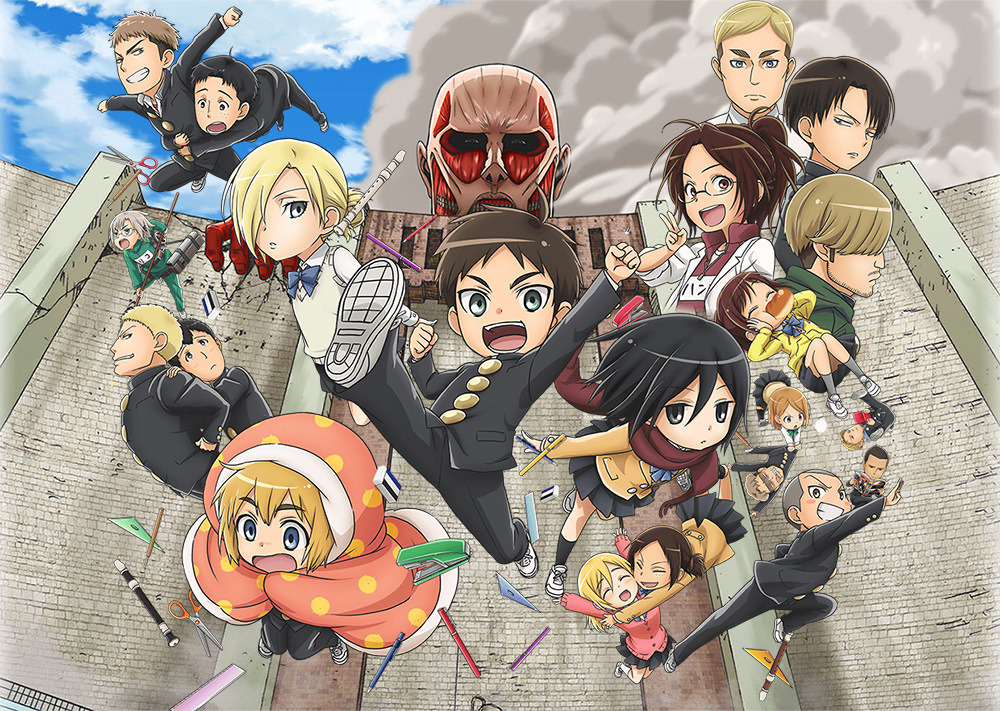 The premise of the show is that all of the Attack on Titan characters, in an over exaggerated form, go to junior high school and must stop the Titans from taking everything they hold dear… that being their lunch.