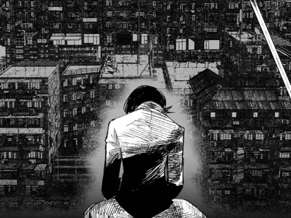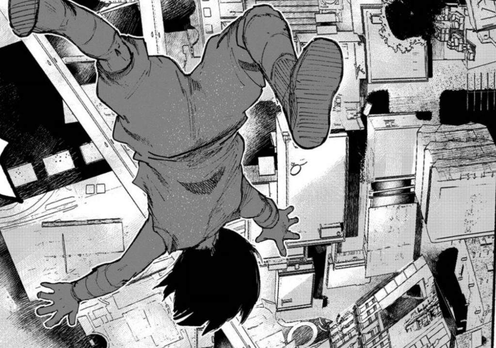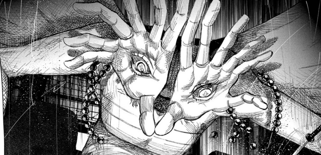 This resurrection appears from a dying Azuma’s POV, as we see a statue looking down on him, presenting its hands, almost as if it is gifting him his Choujin power.